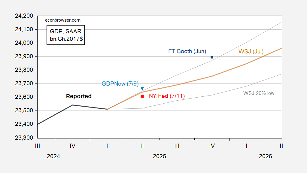 Figure 1: GDP (bold black), WSJ July survey mean (tan), lowest/highest 10% based on 2025 q4/q4 growth (gray lines), GDPNow of 7/9 (inverted light blue triangle), NY Fed nowcast of 7/11 (red square), all in bn.Ch.2017$, SAAR. Source: BEA, WSJ, Atlanta Fed, NY Fed, and author’s calculations.